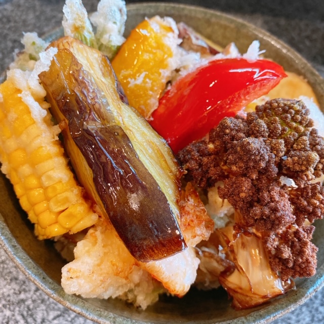 揚げたてサクサクのめちゃくちゃ美味しい野菜達がご飯に乗っかっていて、