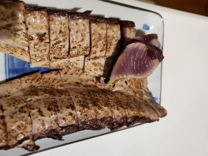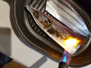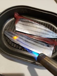 お安く仕入れたカツオをバーナーで炙っていきます。