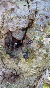 ではいきますよ。桜の花が散り、その木ウロに見えるはヨコヅナサシガメの巣でしょうか。