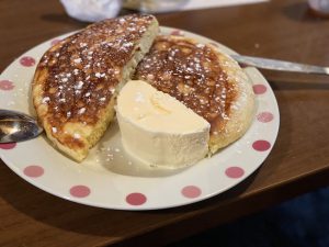 生地は完璧でしたが、型が無く厚みのないパンケーキが出来上がりました。