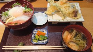 新鮮な魚の海鮮丼と塩を付けての天ぷら