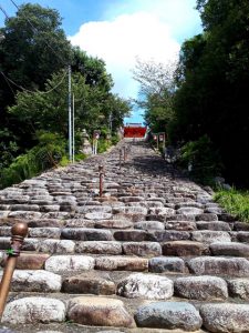 道後温泉駅前にある伊佐爾波坂を上ると、目の前に長い石段が見えます。