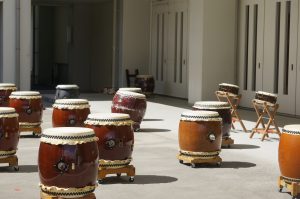 中庭に演奏場を作って和太鼓が並べてあり 静かな緊張感が伝わってきました