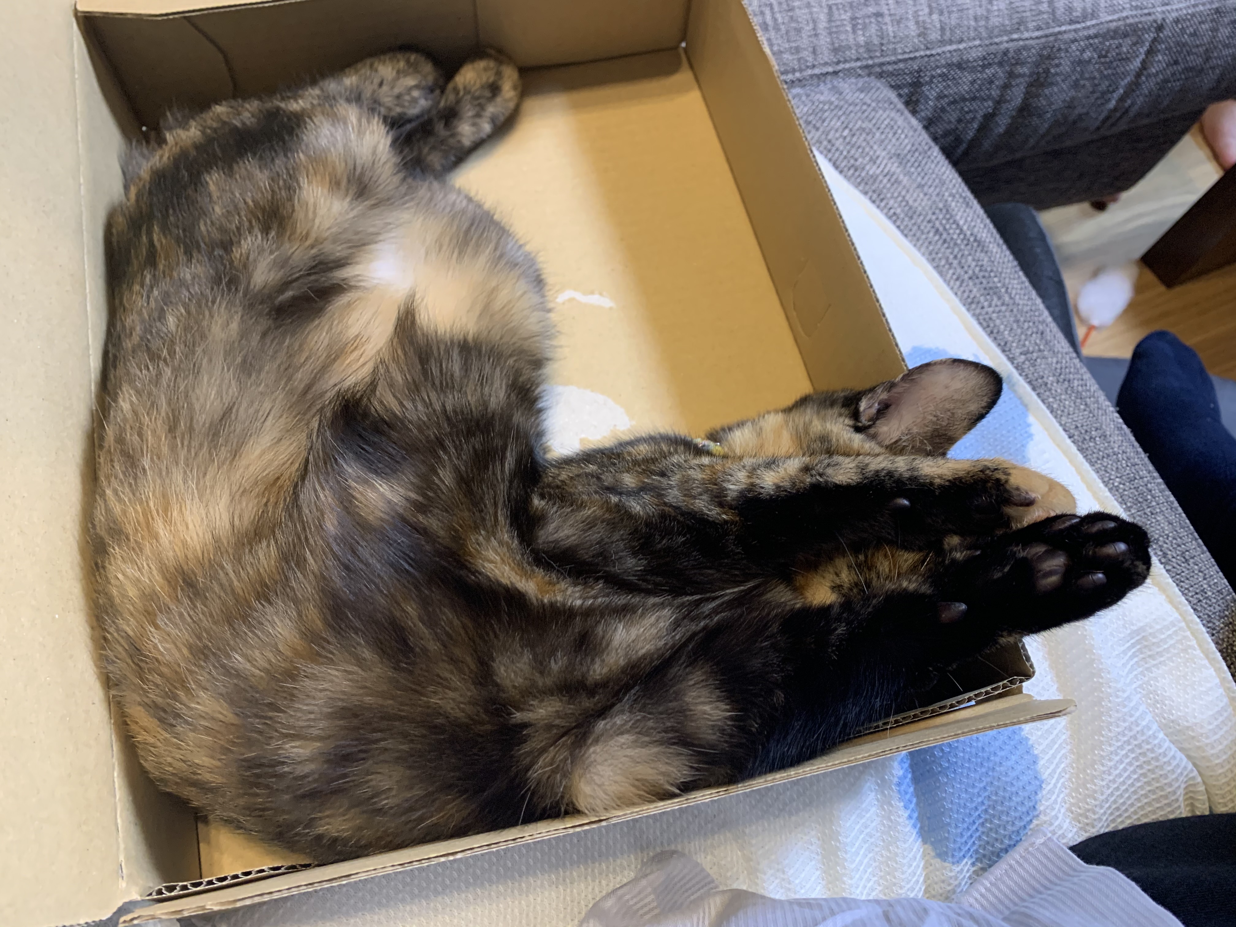 そんなおはぎちゃんの最近のお気に入りはアマゾンの薄めの段ボールのようで、中で寝ていたり飛び掛かって遊んでいたり、ボロボロになる日は近そうです…![]()