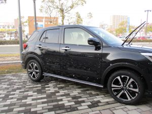左の写真は見えにくいかなぁと、展示車の黒色ロッキーをバックに撮ってみました(*´▽`*)