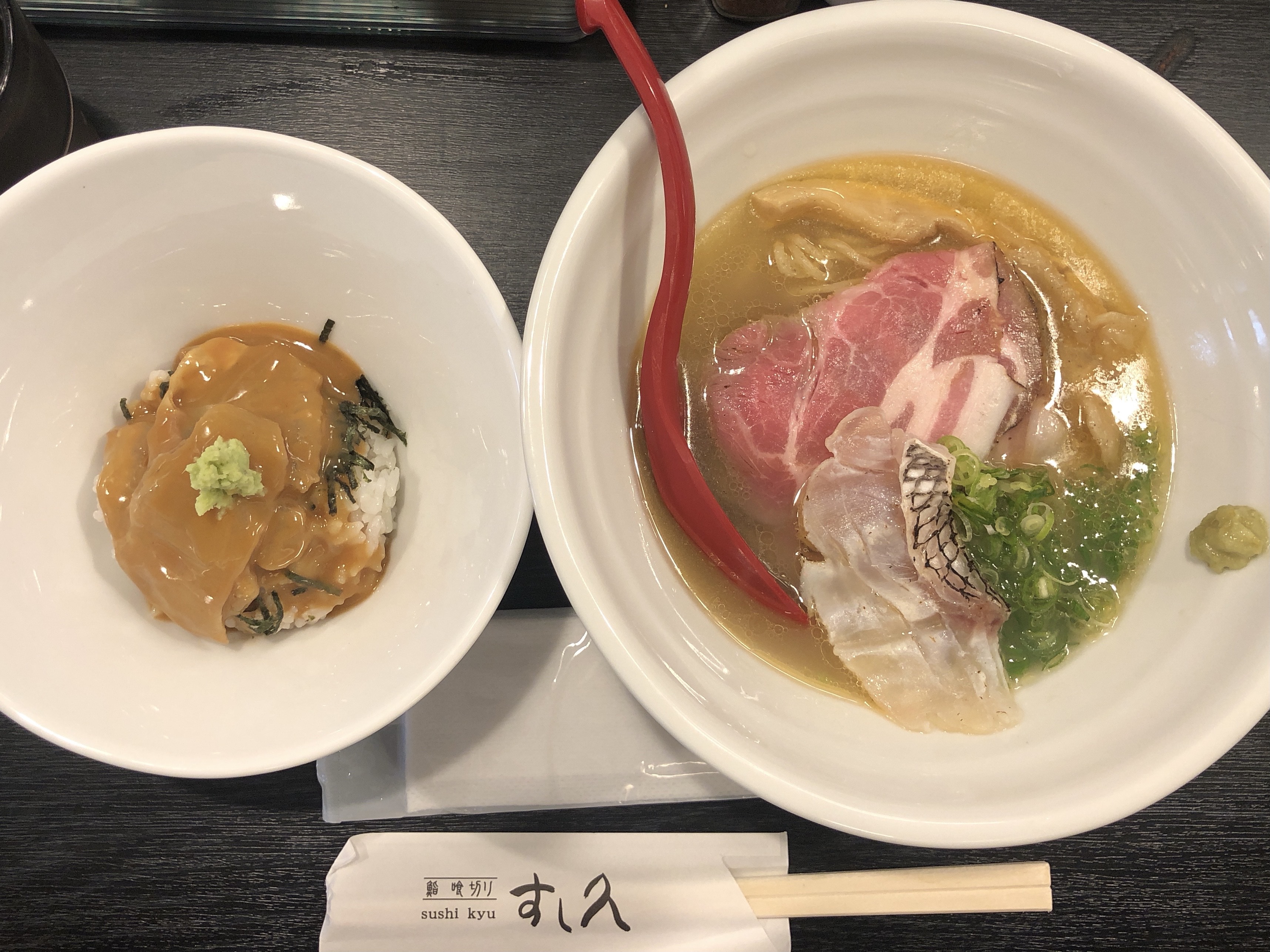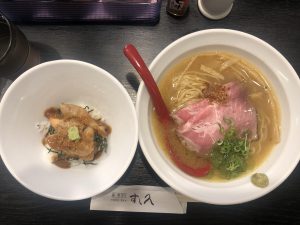 ラーメンには昆布締めの鯛とレアチャーシューがのっています♩