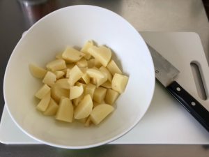 皮むきが完了したら適当な大きさに切り、耐熱のボウルに入れラップをしたら電子レンジへ。