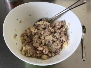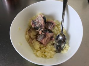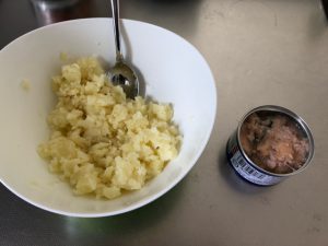 今回の料理?はずばり「サバ缶ポテトサラダ」です。勘の良い方はすでに気付かれたかもしれませんが、TOPの写真が材料です。