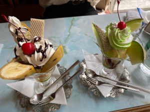 私はメロンパフェ、友人はバナナパフェを注文しました。