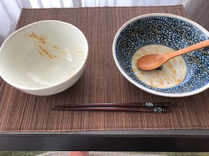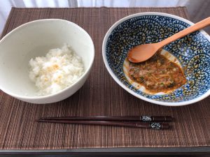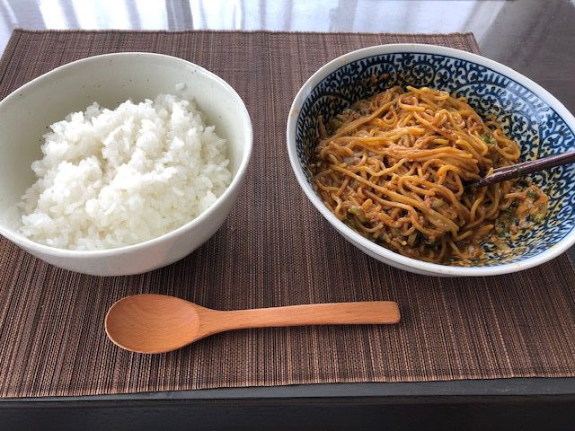 麺と、ご飯を半分まで食べたら器のタレやひき肉にご飯を混ぜ、少し醤油を足します。