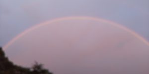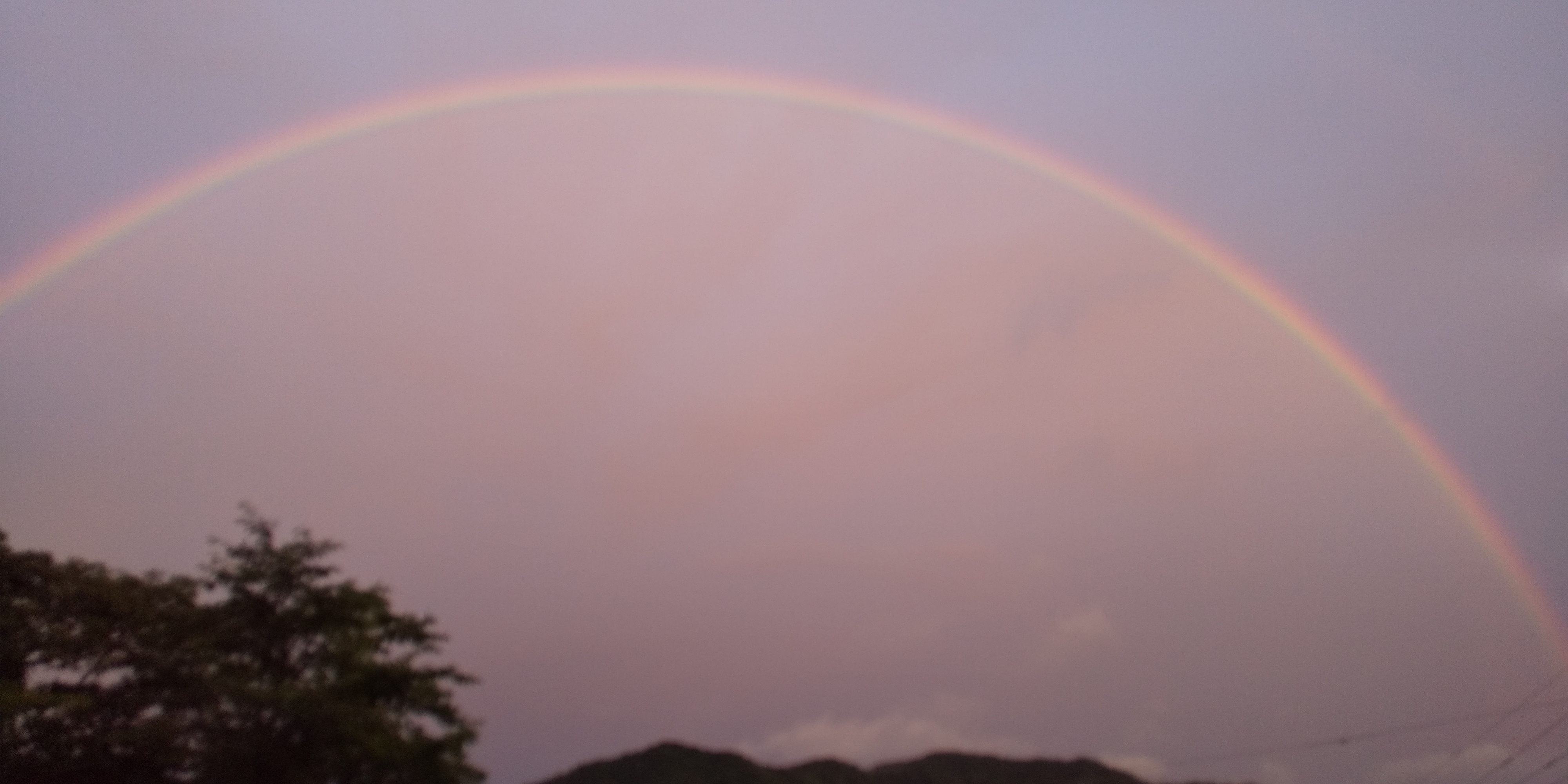サッと雨が降った、とある早朝。日の出直前の虹が出現しました。
