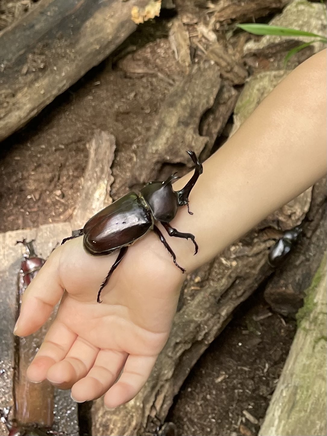 今回は午前中のまだ少し涼しい時間(それでも暑い)に行ったので、カブトムシたちもまだ元気にごはん中でした。
