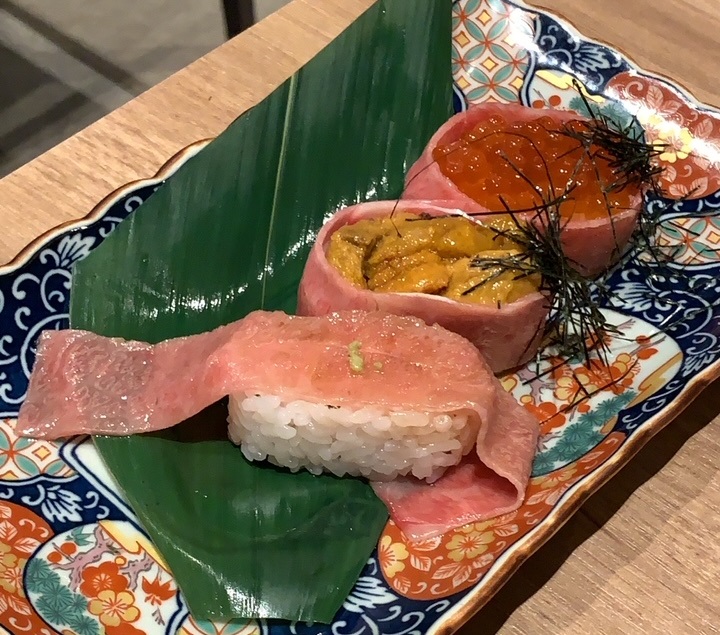 まずは「肉寿司3種盛り(炙りにく、いくら、うに)」!