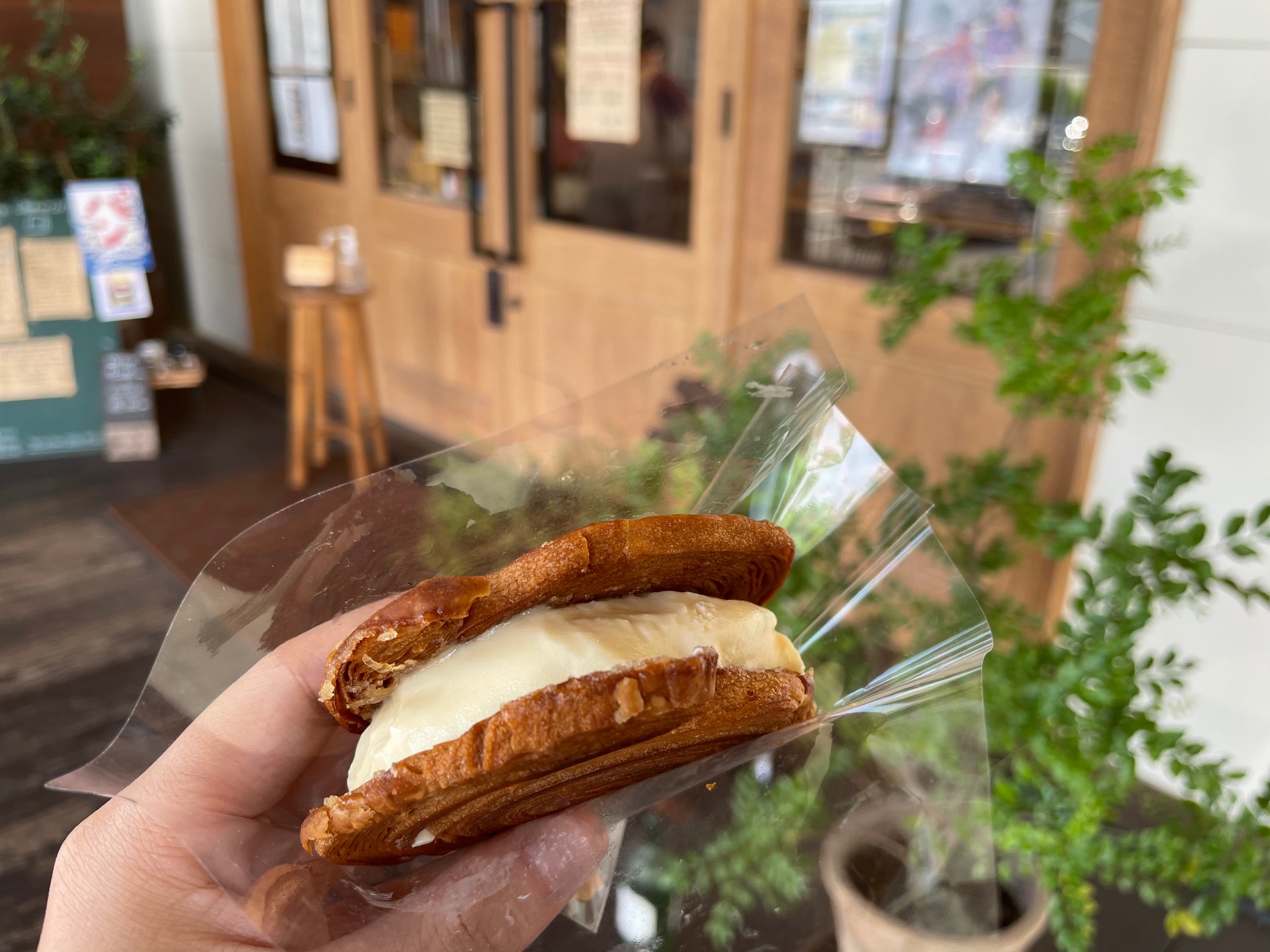 パンにアイスがサンドされています。外のパンは固めのクロワッサンです。