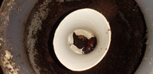 数日後、中をのぞいてみると無事に羽化してました。ノコギリクワガタらしい、い~い赤茶色です。