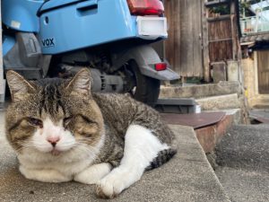 商店街を抜けて小さな小道に入ると、早速あちこちで猫が休んでいるのを見かけました!写真を撮るために少し近づいたのですが、驚くこともなく撮らせてもらえたので嬉しかったです♪