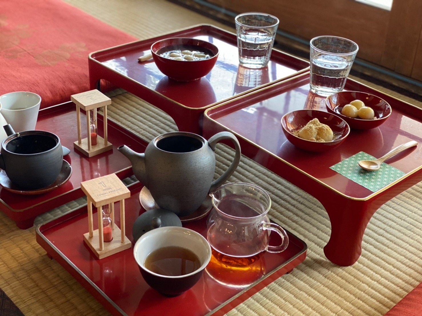 縁側の席で紅葉を見ながらおいしいお茶とお団子をいただいて癒されました!!