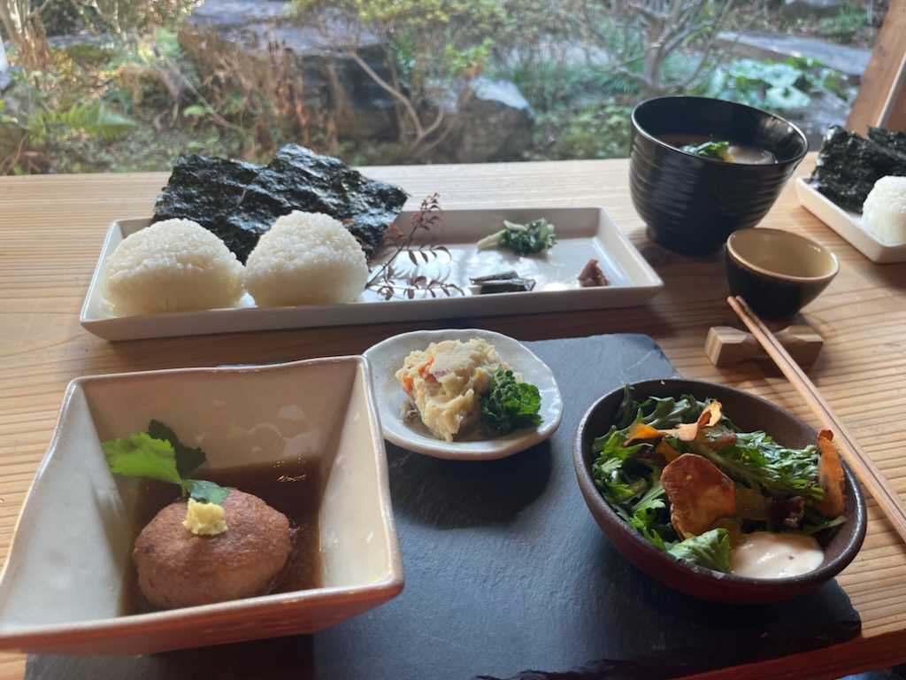 奥に写っているのが粕汁と塩むすびです。