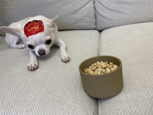 いい子に「待て」ができたのでご褒美に豆を数粒あげました(*^。^*)