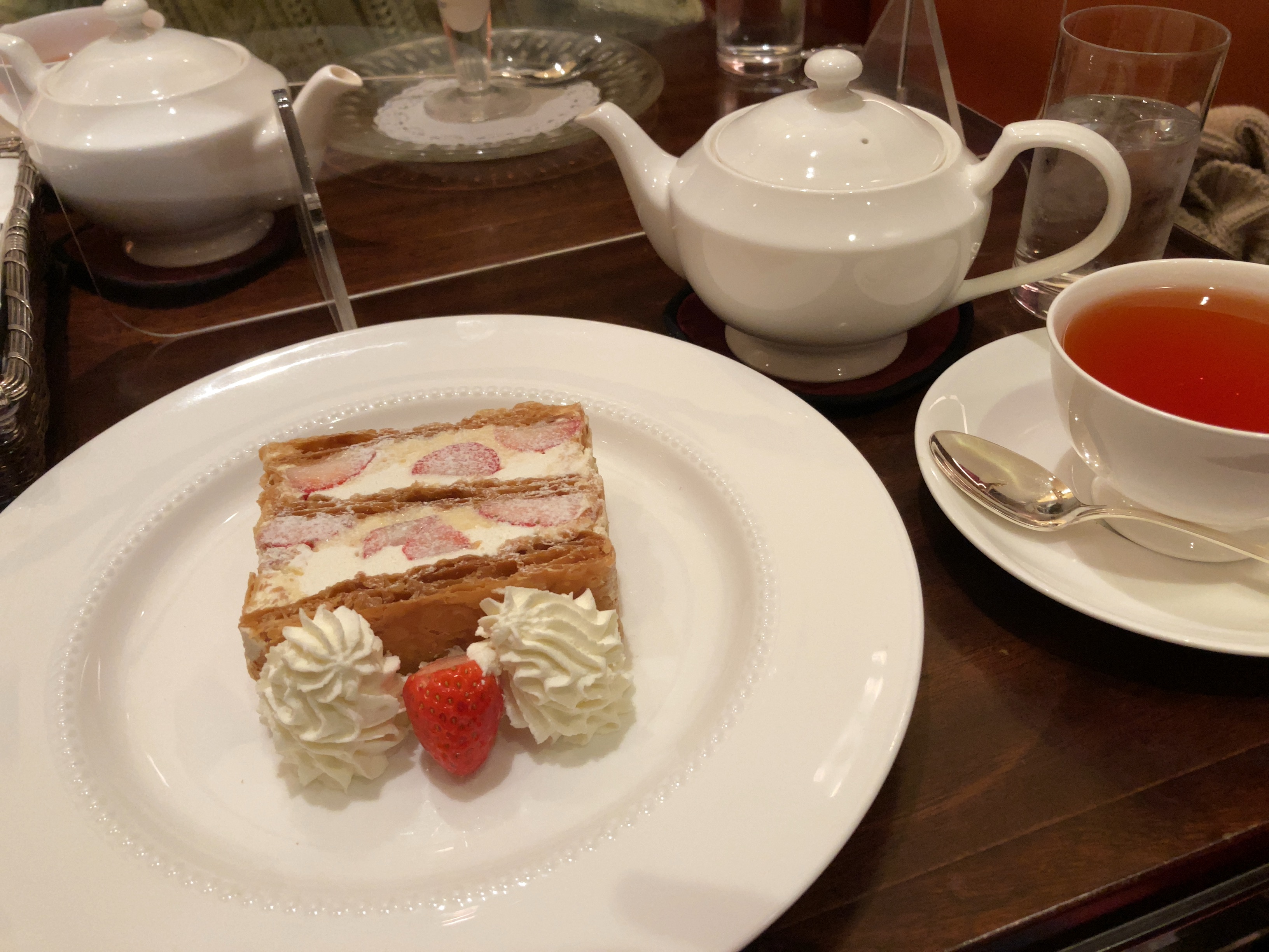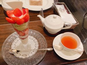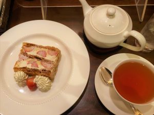 私はナポレオンパイを、友人は苺とピスタチオのパフェを注文!