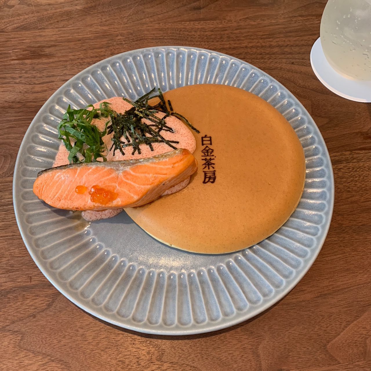 鮭といくらのパンケーキで、福岡名産の明太子のソースがかかっています!
