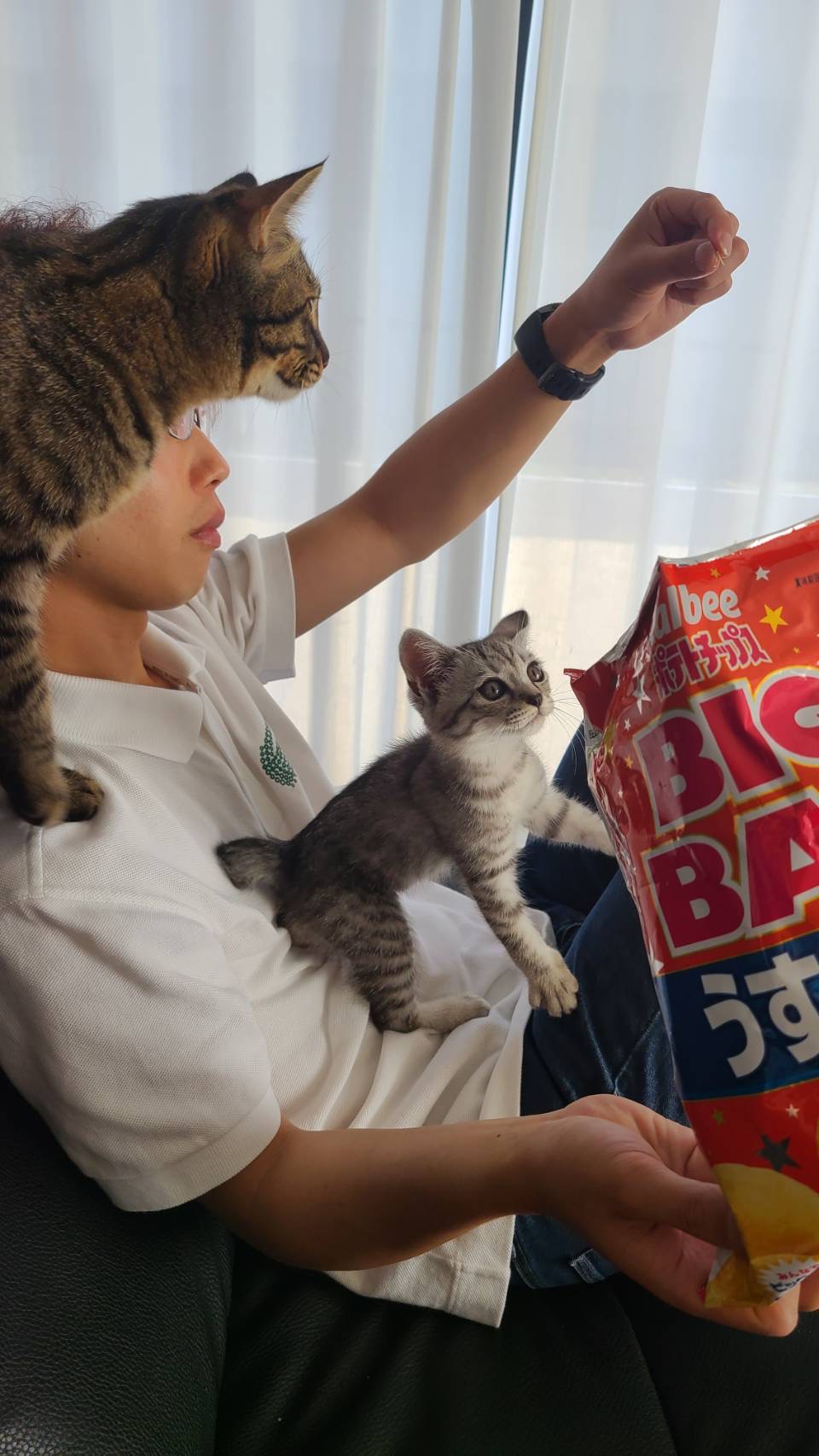 すぐに近寄ってきて、ポテチを狙ってきます(笑)