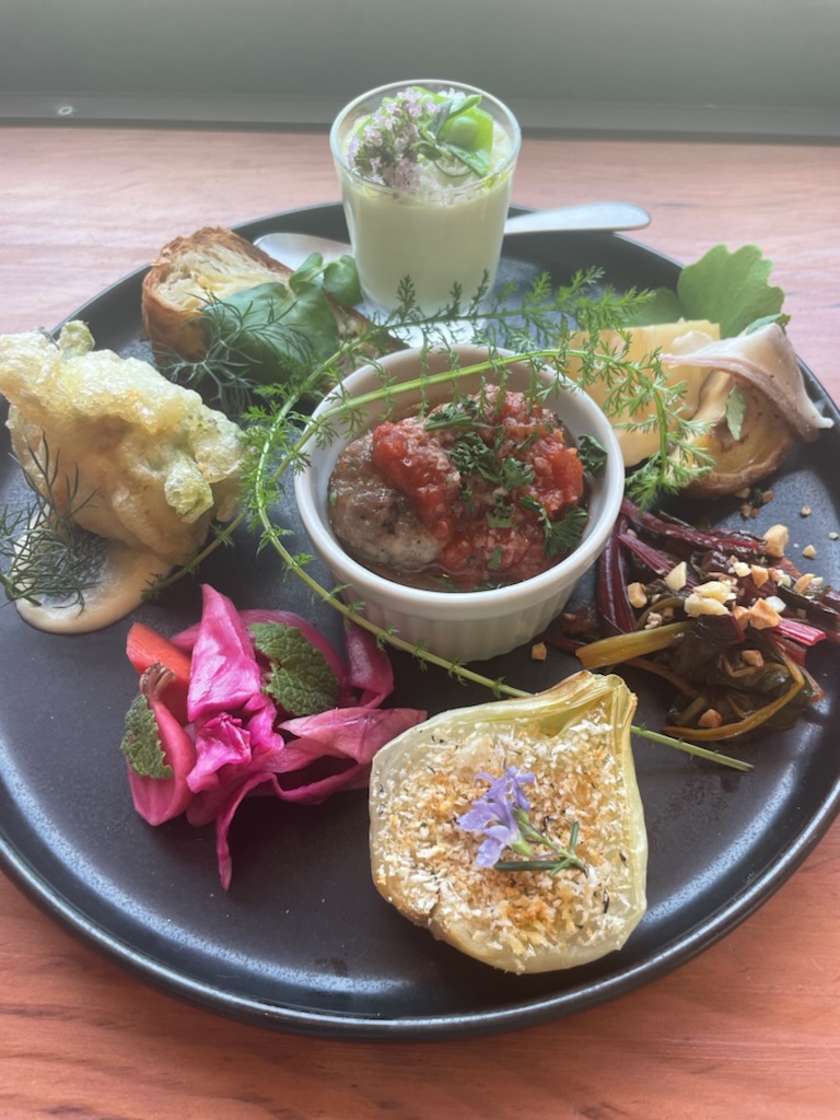 この日はそら豆のパンナコッタや新玉ねぎの香草パン粉焼き、クレソンと木の子のキッシュ、瀬戸のもち豚のポルペッティーになど