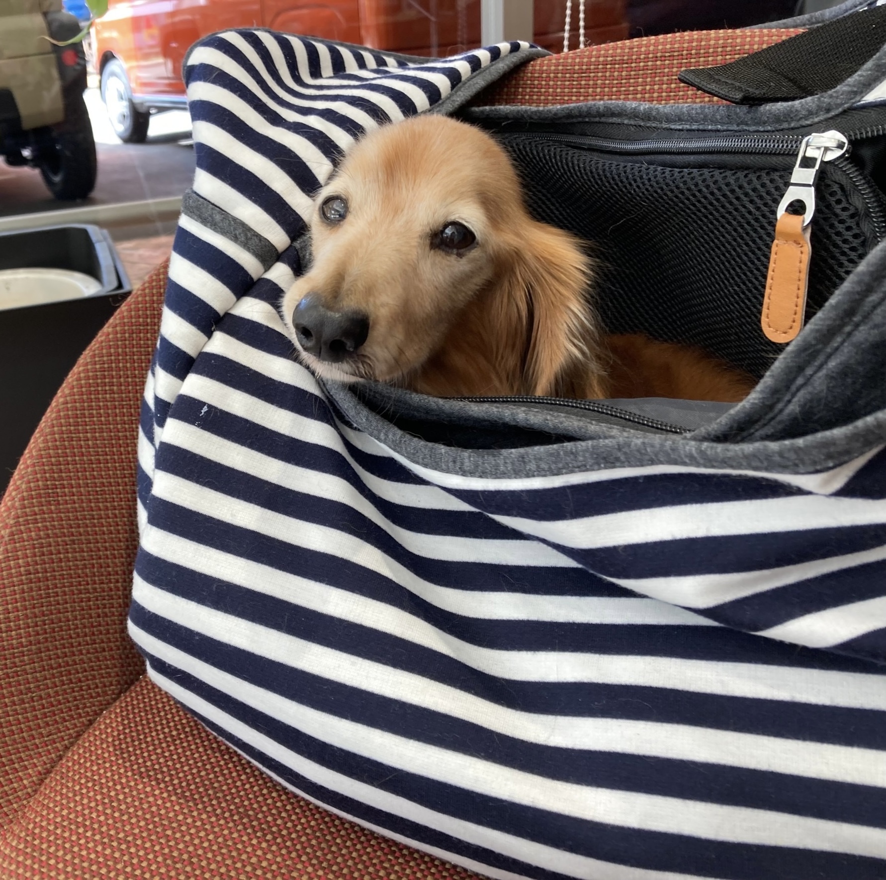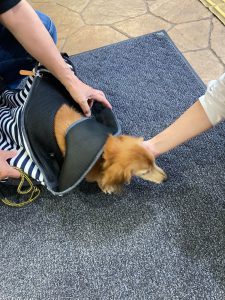 大好きなパパママと一緒に犬用キャリーバックに入ってご来店してくれます。