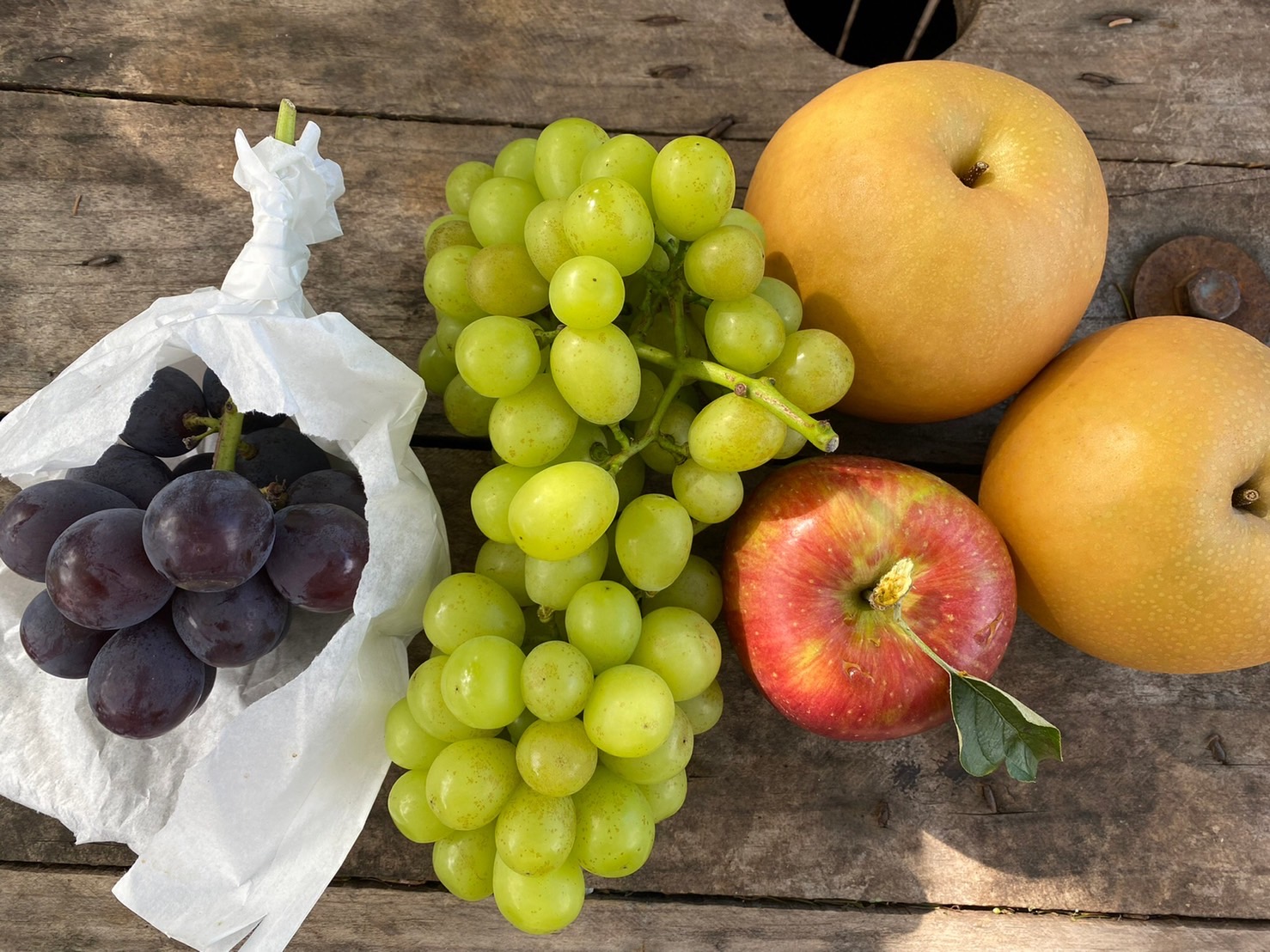 今の時期はぶどう、りんご、梨、マスカットなどが採れるとのことだったので、広い農園を歩き回りたくさん採りました。