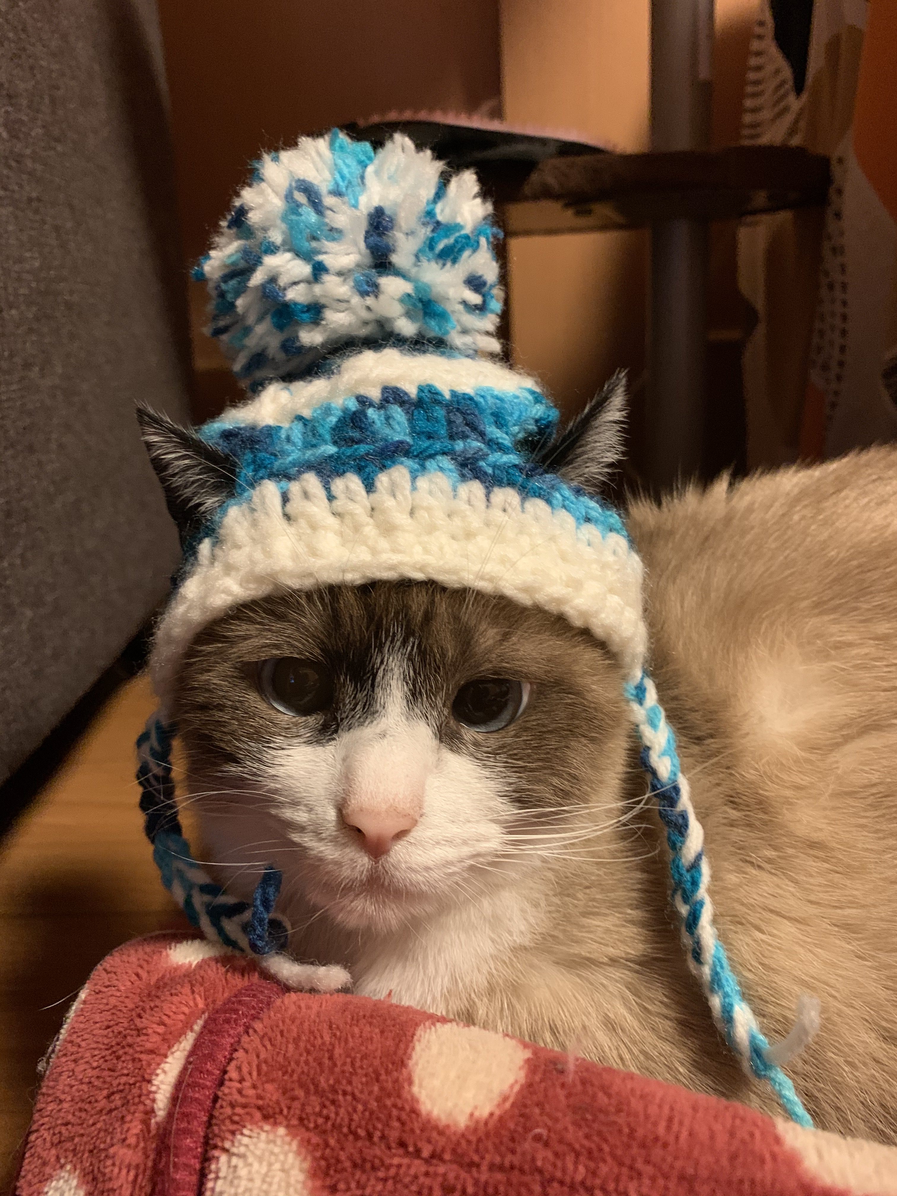 最近は朝晩が寒くなってきたので、妻がミルクの帽子を作りました。