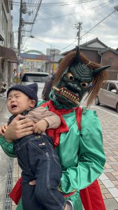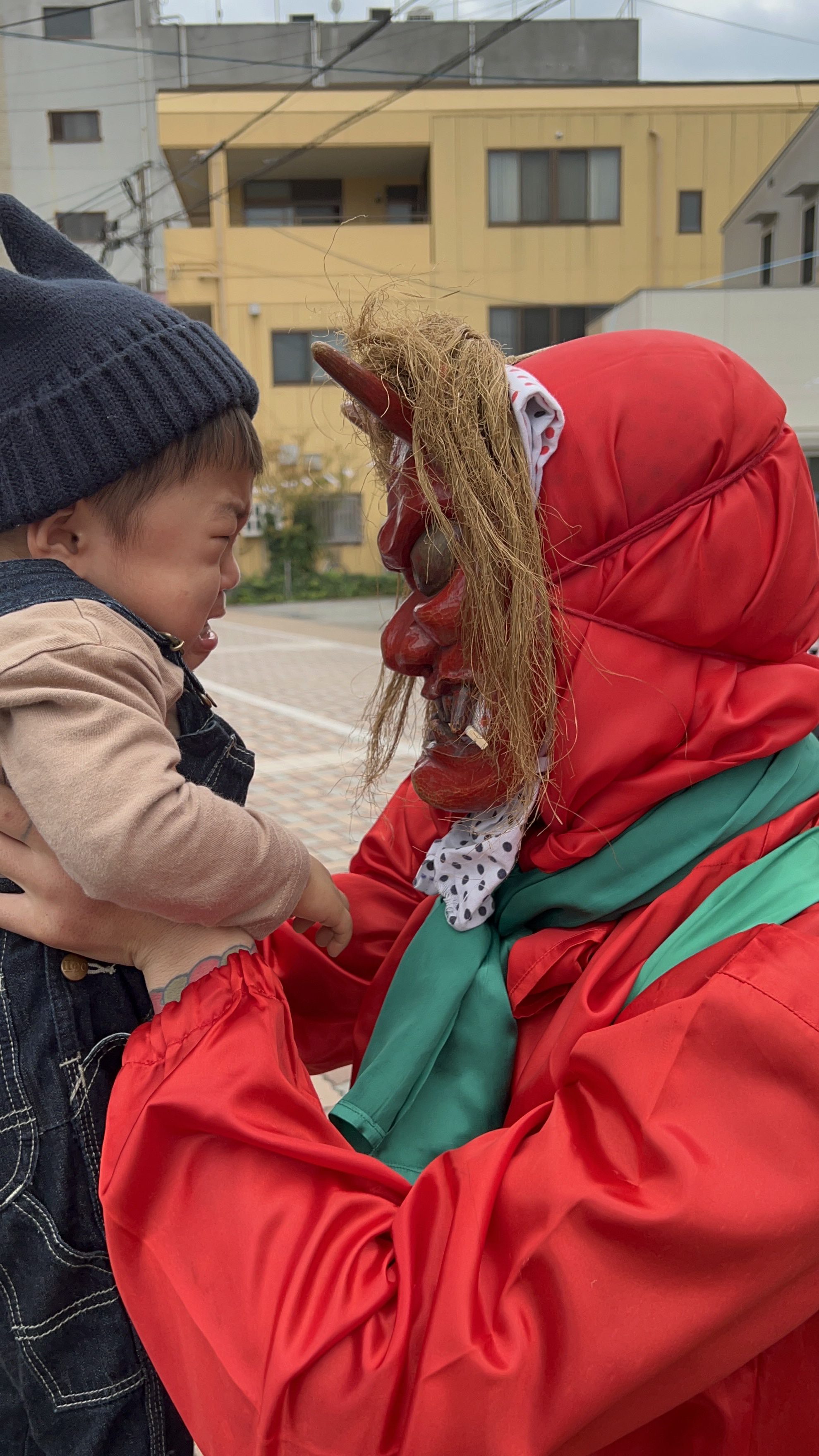 黄色や赤、緑など派手な衣装つけて秋祭りに登場する鬼たちです!