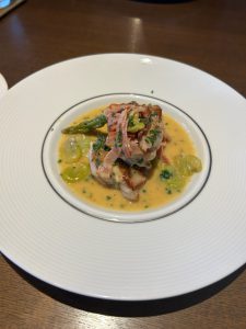 メインの春の野菜とチキンの白ワイン蒸し↑