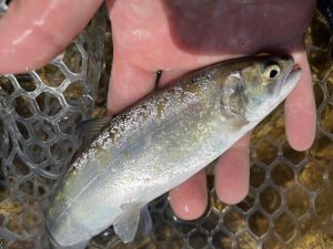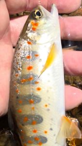 放流魚の特徴は少し表面がすれているようで、あまご特徴の赤い斑点が