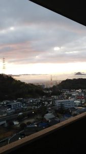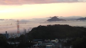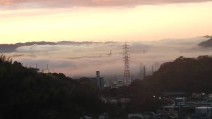 自宅は西区の高台にあるのですが、2月頃の寒い朝に窓から市内方向を眺めると、幻想的な景色が広がっていました。