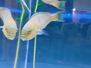 進んでいくとヒレが手のようになったお魚や、水色と黄色の鮮やかな縞模様があるお魚などいろんな種類がいて