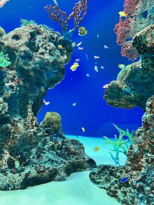 入ってすぐ、大きな水槽にカラフルなお魚たちが気持ちよさそうに泳いでいました