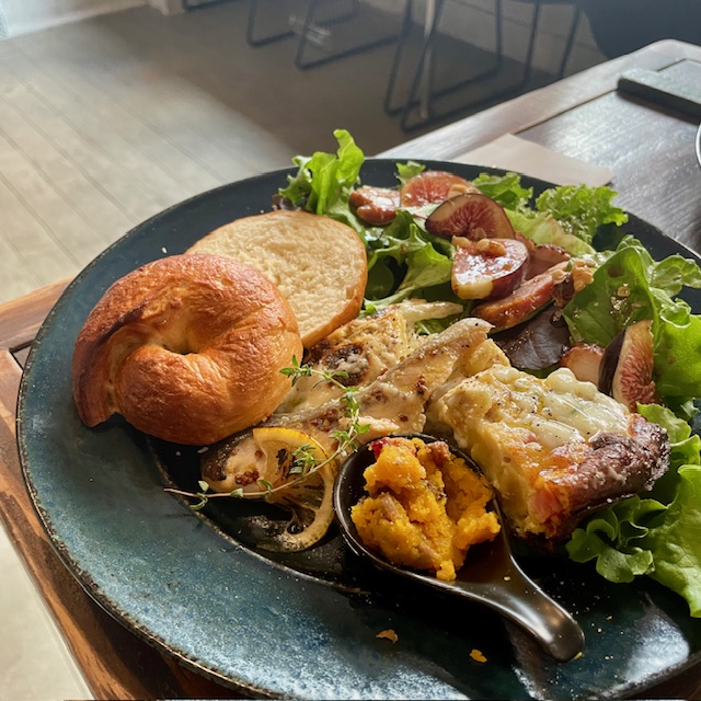 イチジクのサラダやグラタン、カボチャとドライフルーツのペースト、自家製豆乳ベーグルなどたくさんの料理が乗っていました!!