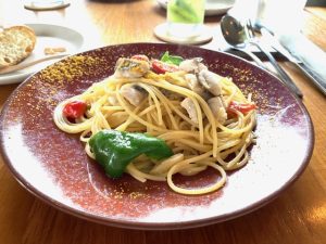 前菜(上)の後に、私が選んだ太刀魚・甘長唐辛子・ボッタルガのパスタ(下)をいただきました🍽