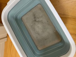 お見せできないほど汚れていたのですすぎ最中の水をお見せしますが、やはり市販のエアコン洗浄では取れない汚れがごっそり取れました。
