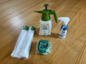エアコン本体を洗浄する霧吹きと、養生テープ、エアコンの周りに汚れが飛び散らないようにする養生マスカーというビニールも購入しました。