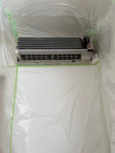 次に、掃除をするときにまわりが汚れたりするのを防ぐために、マスカーでエアコンの周りを養生していきます。