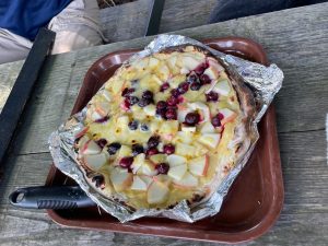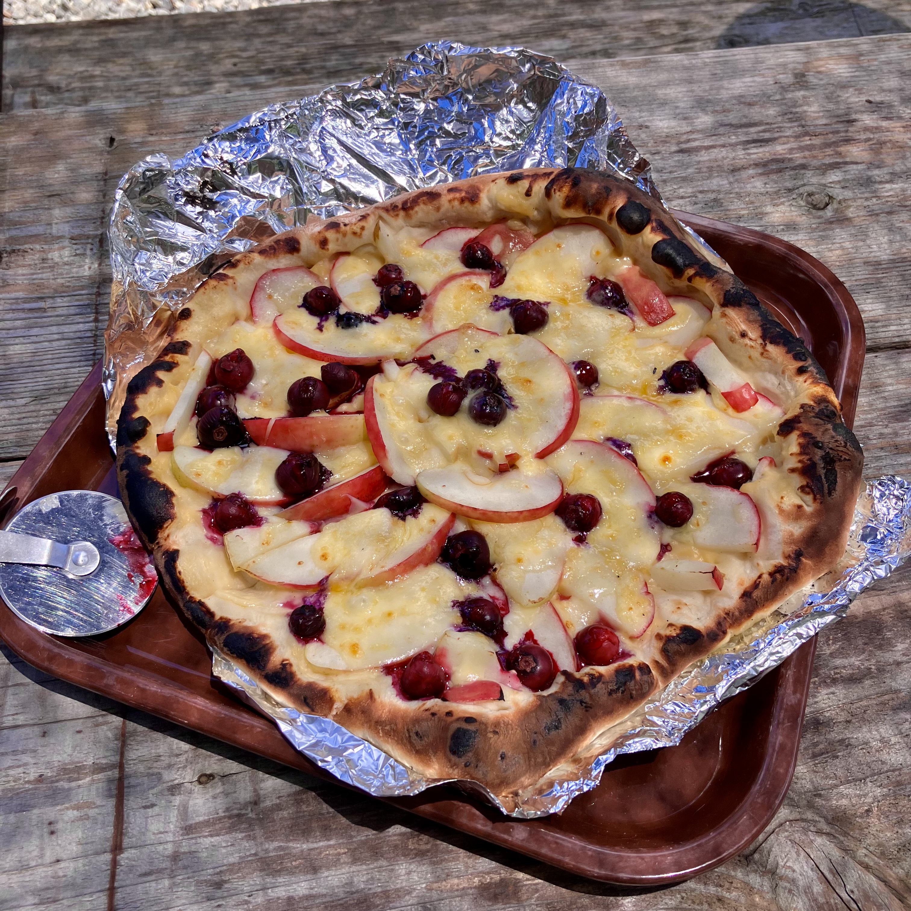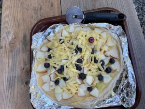 薄く伸ばしたピザ生地にカスタード、りんご、ブルーベリー、チーズをのせていきます…。