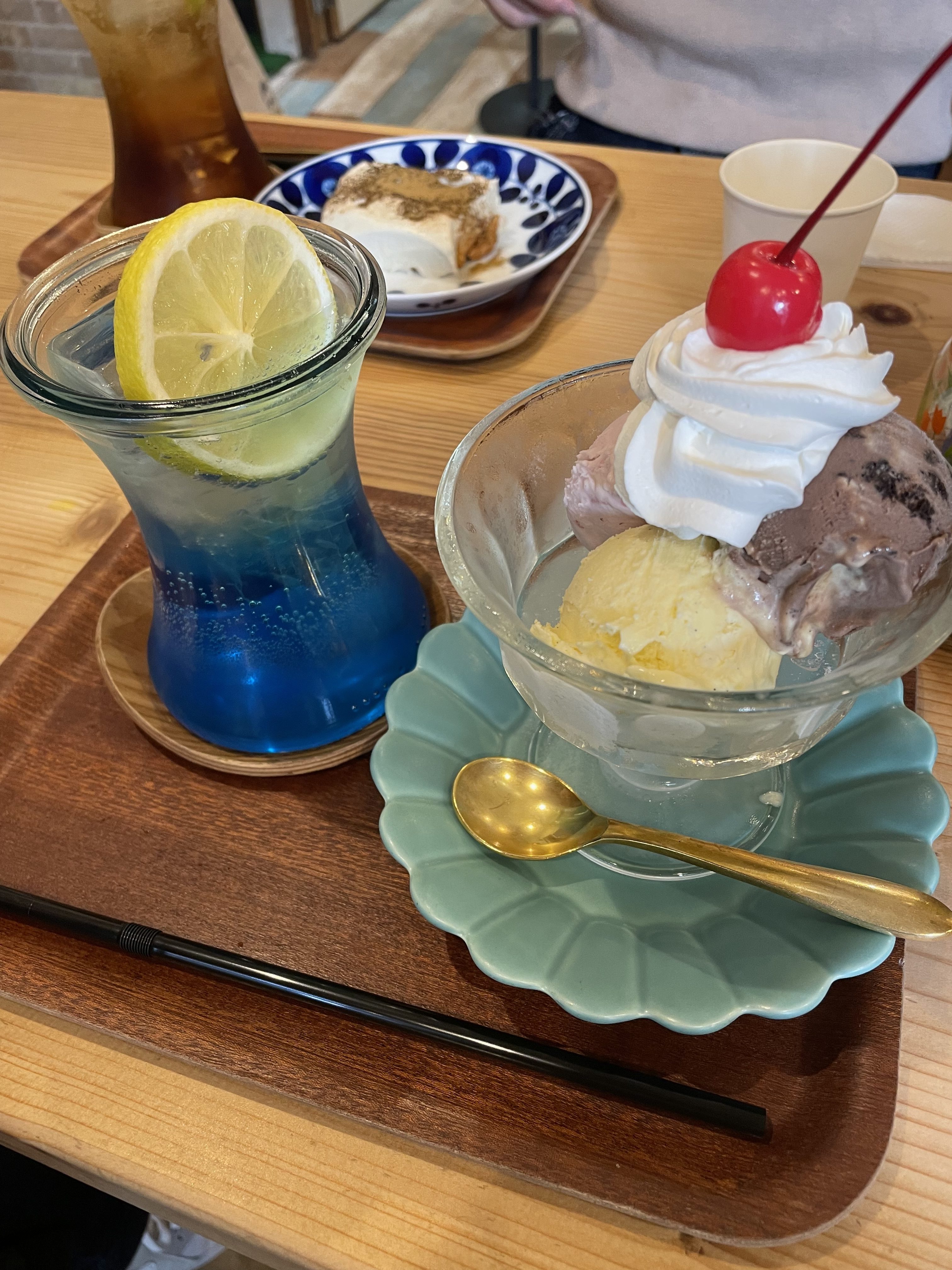 私は、ブルーキュラソーレモンスカッシュのデザートセットで、アイスクリーム3点盛りを注文!