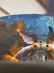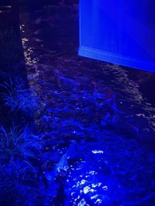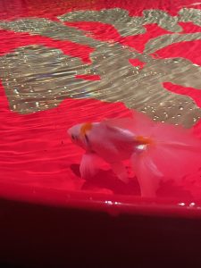 輝く室内の中でふわふわ浮かぶお魚たちに