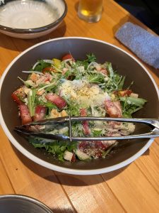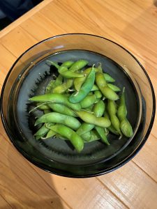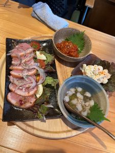 最初に枝豆、サラダ、合鴨のカルパッチョ、たこわさ、チャンジャです♪