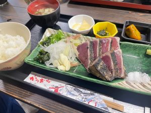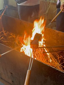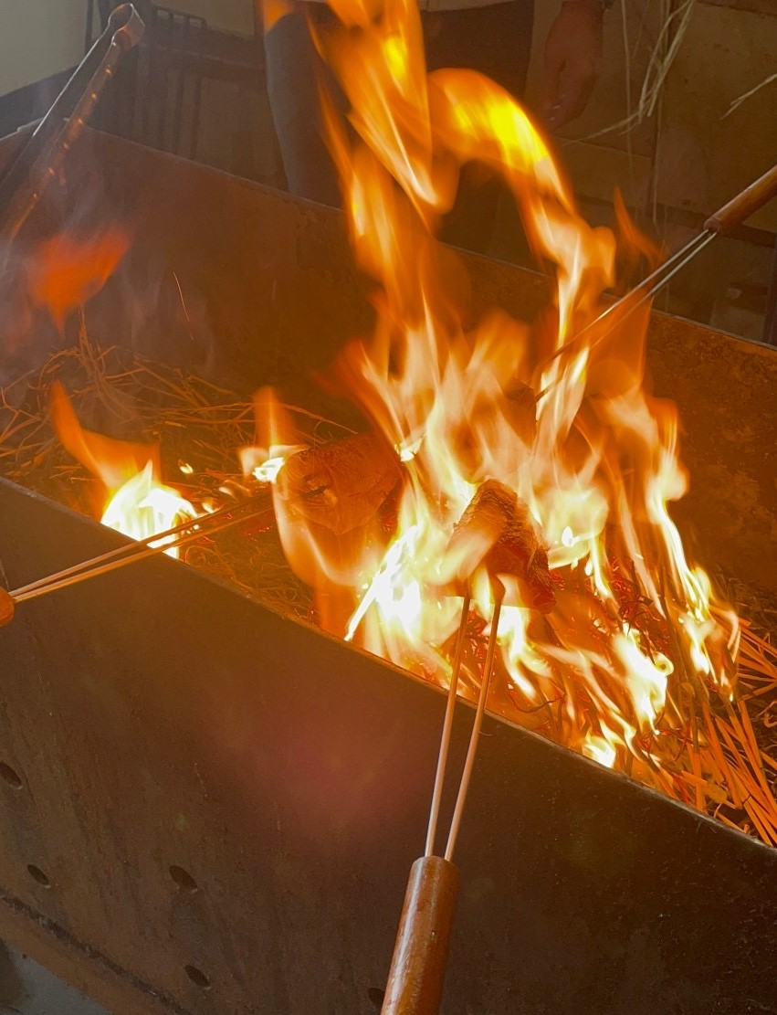 何が何だか分からないまま串に刺さったカツオを炎の中へ🔥