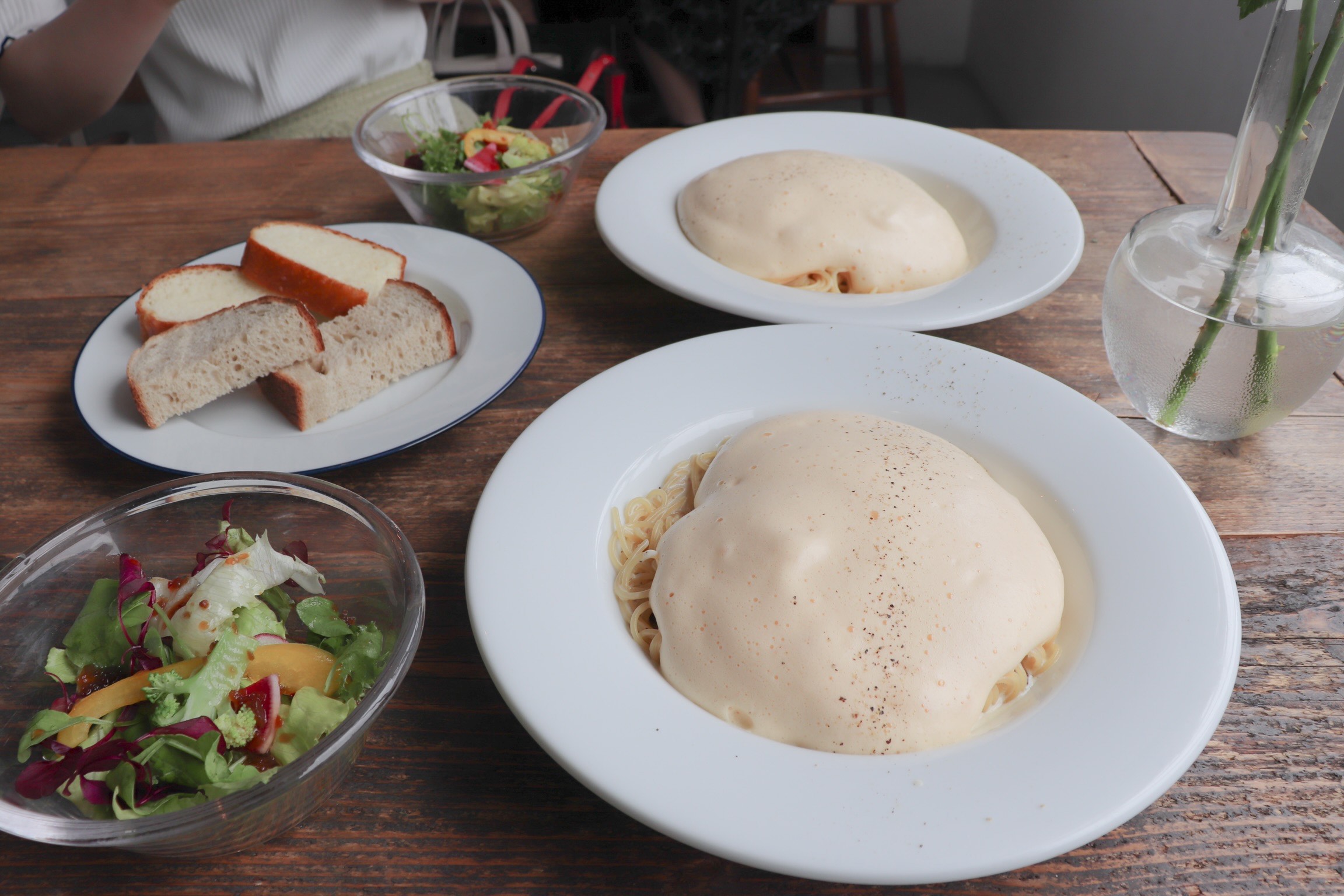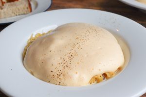 濃厚なチーズソースと絡まったパスタにふわふわに泡立てた卵を乗せたカルボナーラ