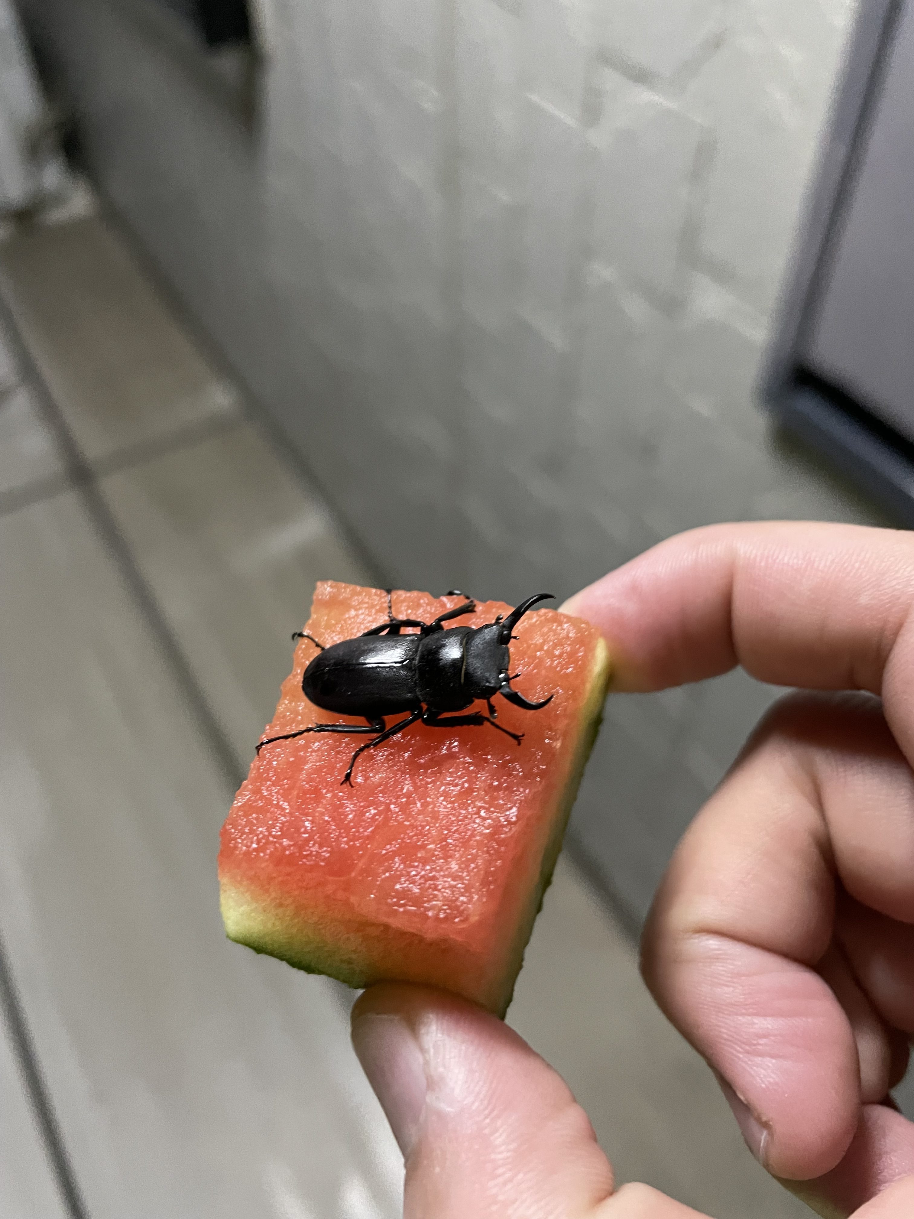 さすがに飼えなかったので、夜にスイカと一緒に玄関に置いておくと、次の日の朝にもまだ玄関前に居座っていました。
