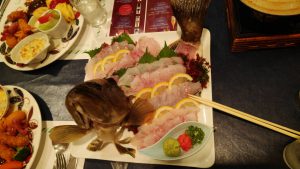 そして、叔父さんの仕掛けにかかったクエをホテルに持ち帰り、捌いてもらい刺身でいただきました(^^)
