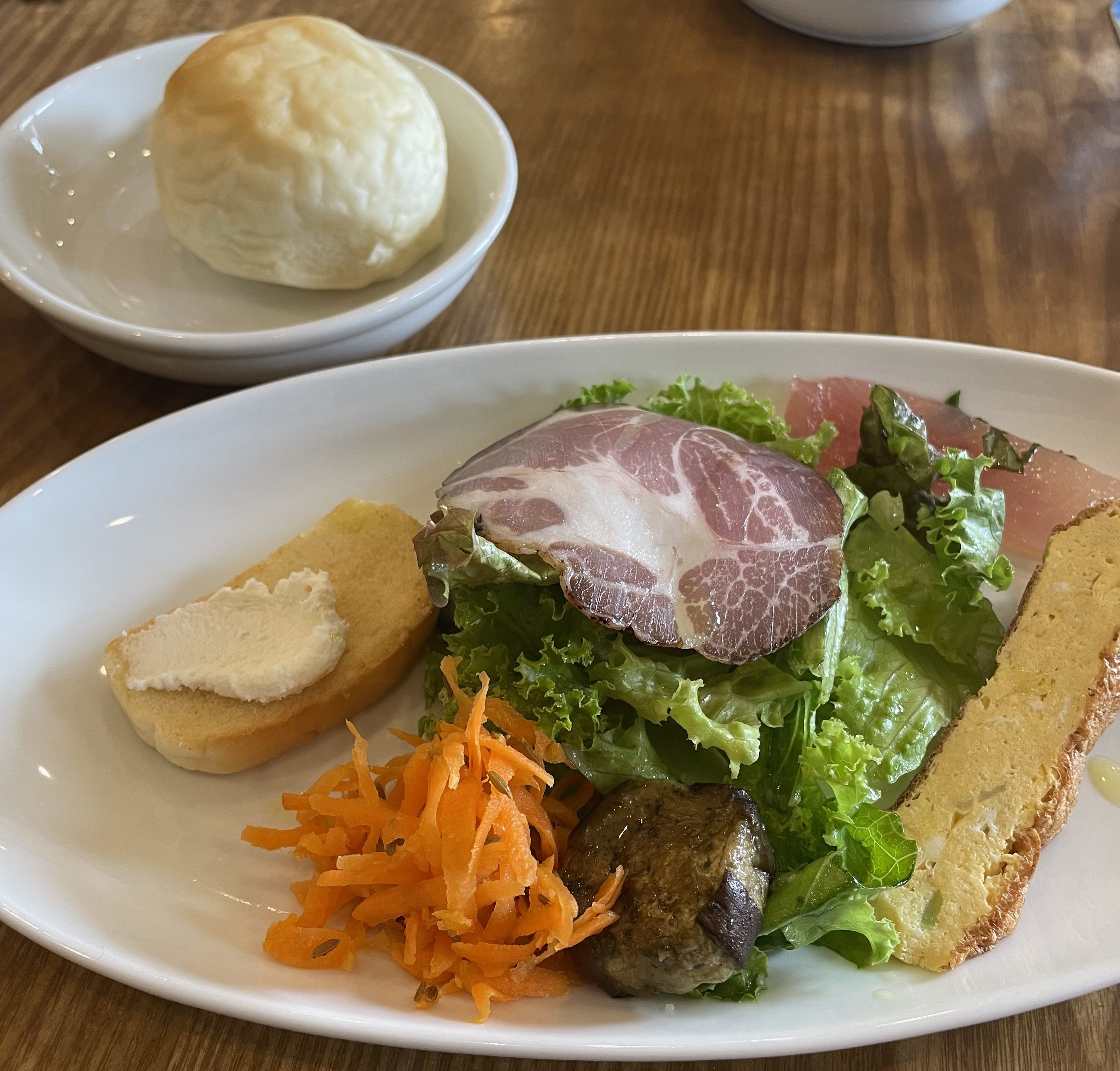 前菜には、サラダや周りにもキッシュや生ハム色々な料理が詰め込まれた一品!